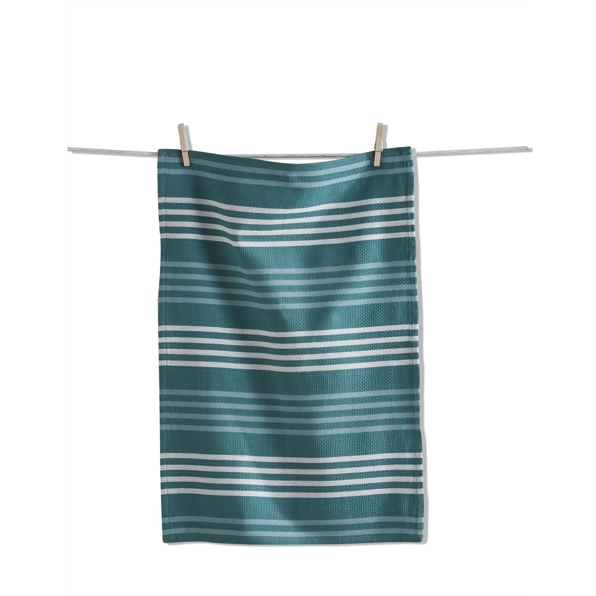 This woven flat weave dishtowel is made from 100% cotton and features a basket weave stripe design in teal. the dishtowel is absorbent and durable, making it perfect for everyday use. the teal color is a bold and stylish addition to your kitchen decor.
