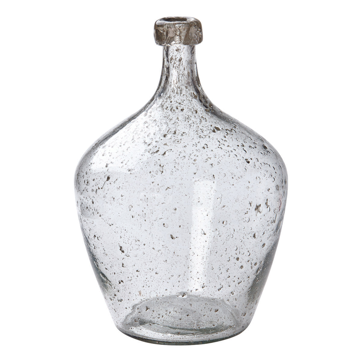 Beautiful glass vase features molten glass that is taken from the furnace and rolled over pebbles, then mouth blown into a mold to develop the shape... giving it a textured organic feel. light plays off the irregular pieces molten into the glass, offering a unique look to any decor. slight variations are to be expected. each piece is one-of-a-kind, no two pieces will be exactly alike.