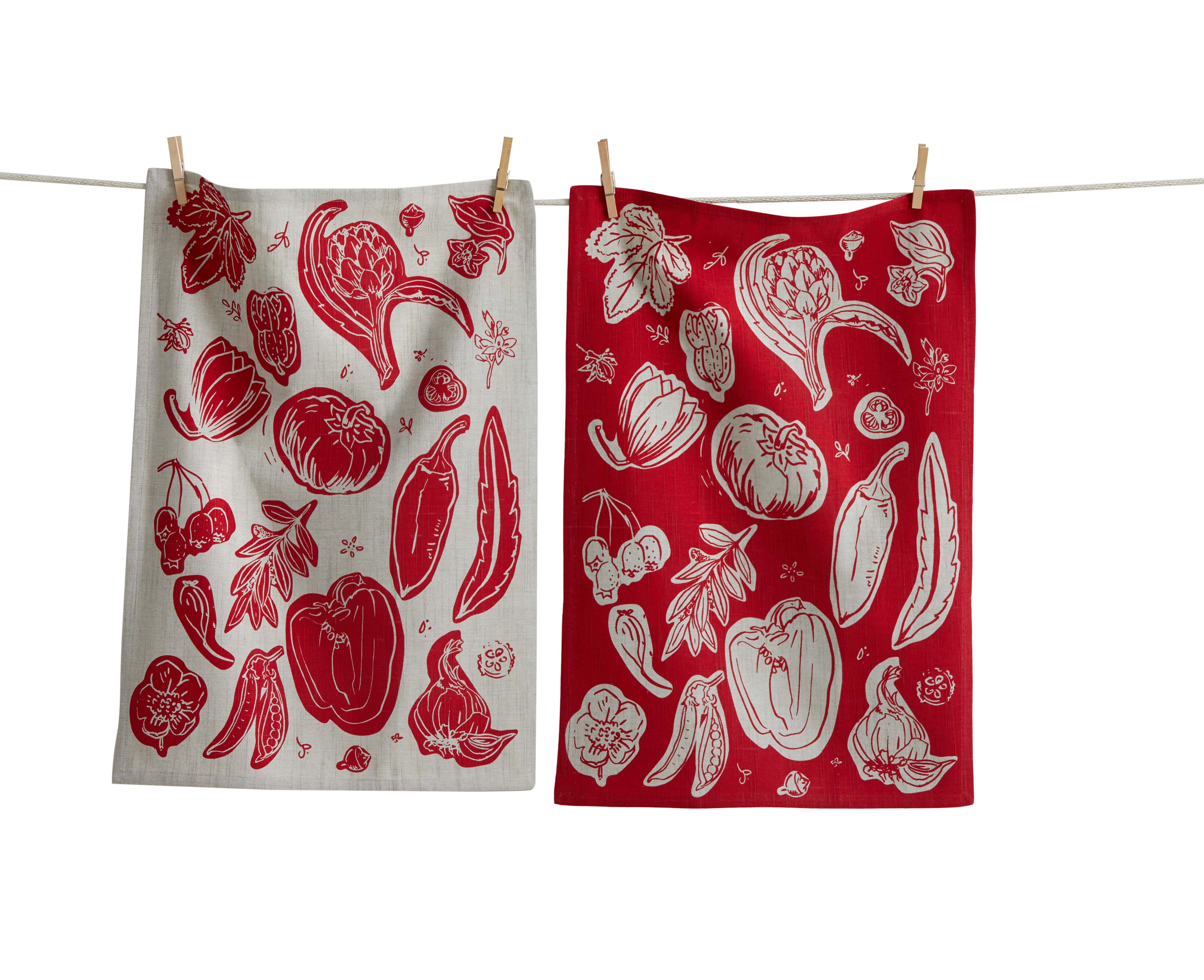 Set includes two soft-washed cotton slub dishtowels with a yarn-dyed woven texture and hang loops. Each features a vibrant hand screen-printed veggie design from the Canyon Print collection. Water-based inks.