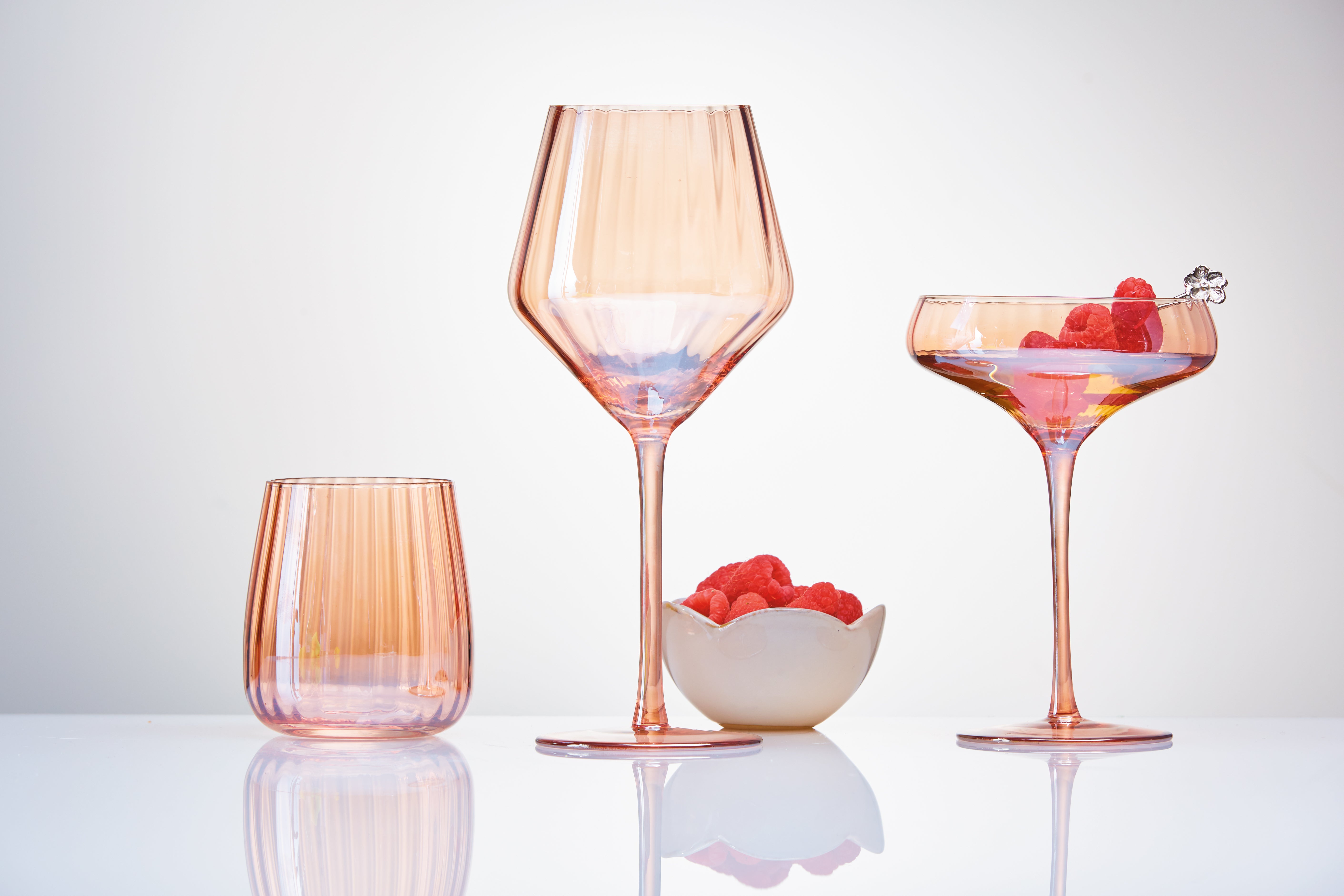 Turn your everyday wine into an extraordinary experience with this stunning stemless wine glass. mouth-blown by skilled artisans, the glass features an iridescent blush finish that shimmers and changes color depending on the light. the wide bowl allows for full appreciation of the wine's aroma and flavor. hand wash recommended to preserve the delicate finish.
