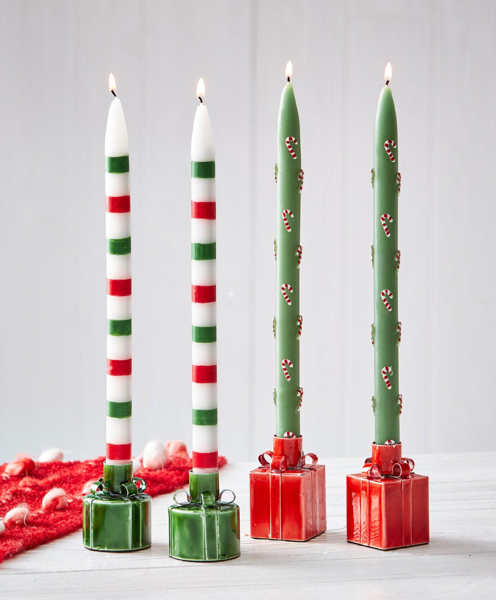 Add a festive touch to your holiday decor with this set of Christmas Stripes Taper Candles. Made from paraffin wax, these candles feature a classic red and white stripe design with hand-painted gold details.
