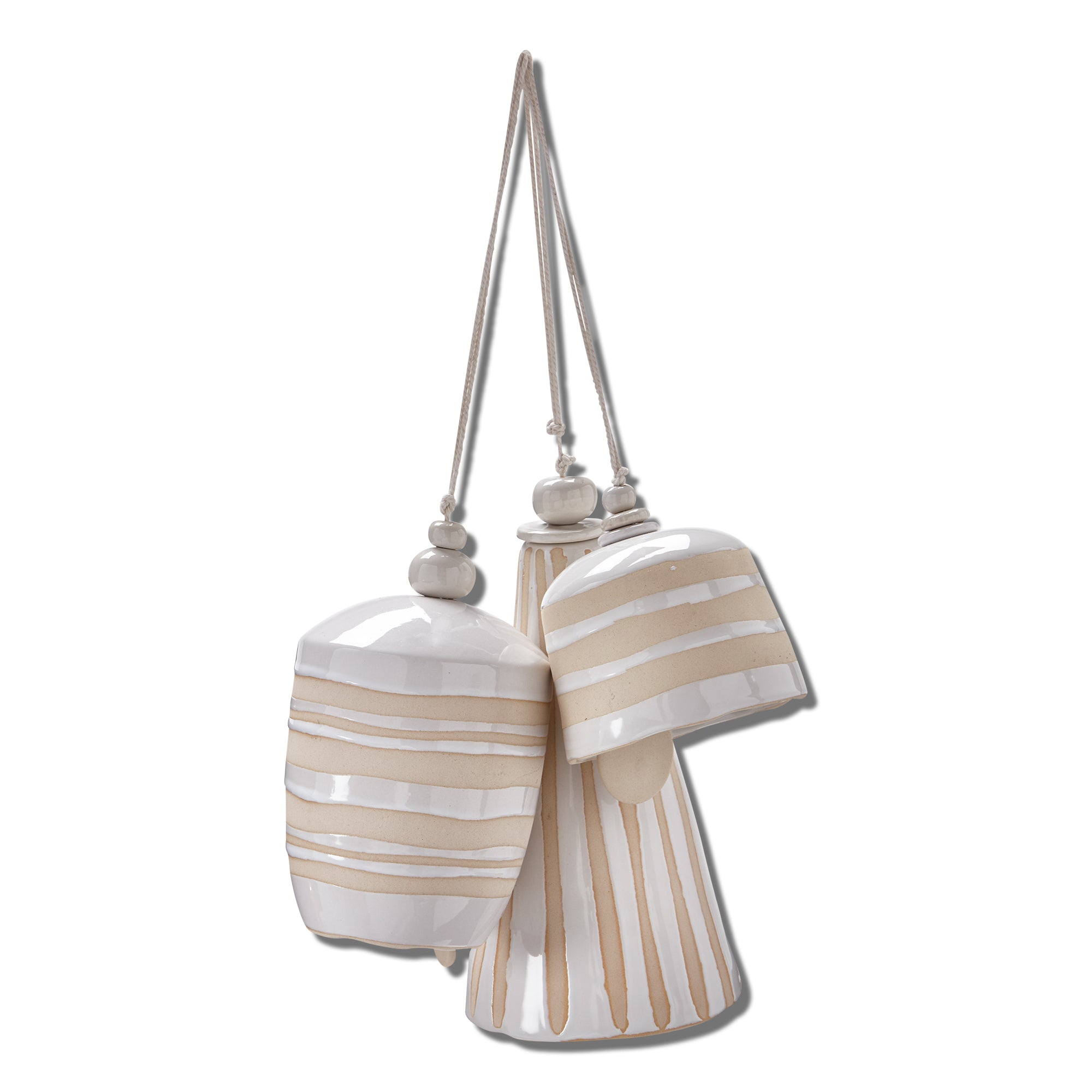 Add a distinctive, magical touch to your home this holiday season. these artisan made stoneware bells feature exposed raw clay with beautifully hand painted organic stripes. assortment includes 1 each of 3 bell shapes/sizes with wax resist stripes (1 large bell, 1 medium bell, 1 small bell).