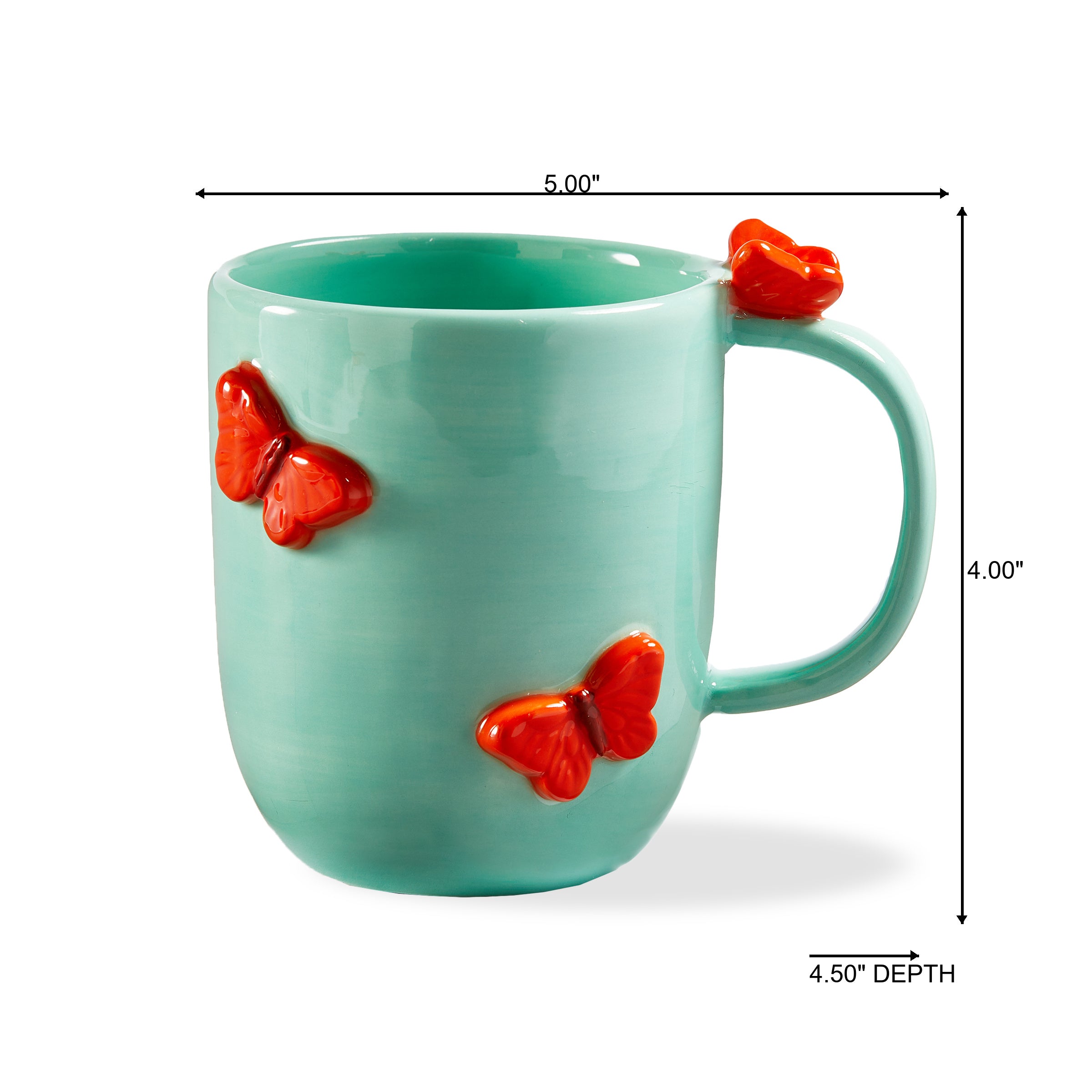A beautiful sculpted mug with a blue body featuring sculpted orange butterflies, what a great collectable and gift! Great for butterfly lovers and plant lovers.View all items in Along The Garden Path.