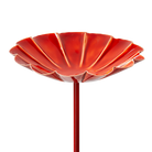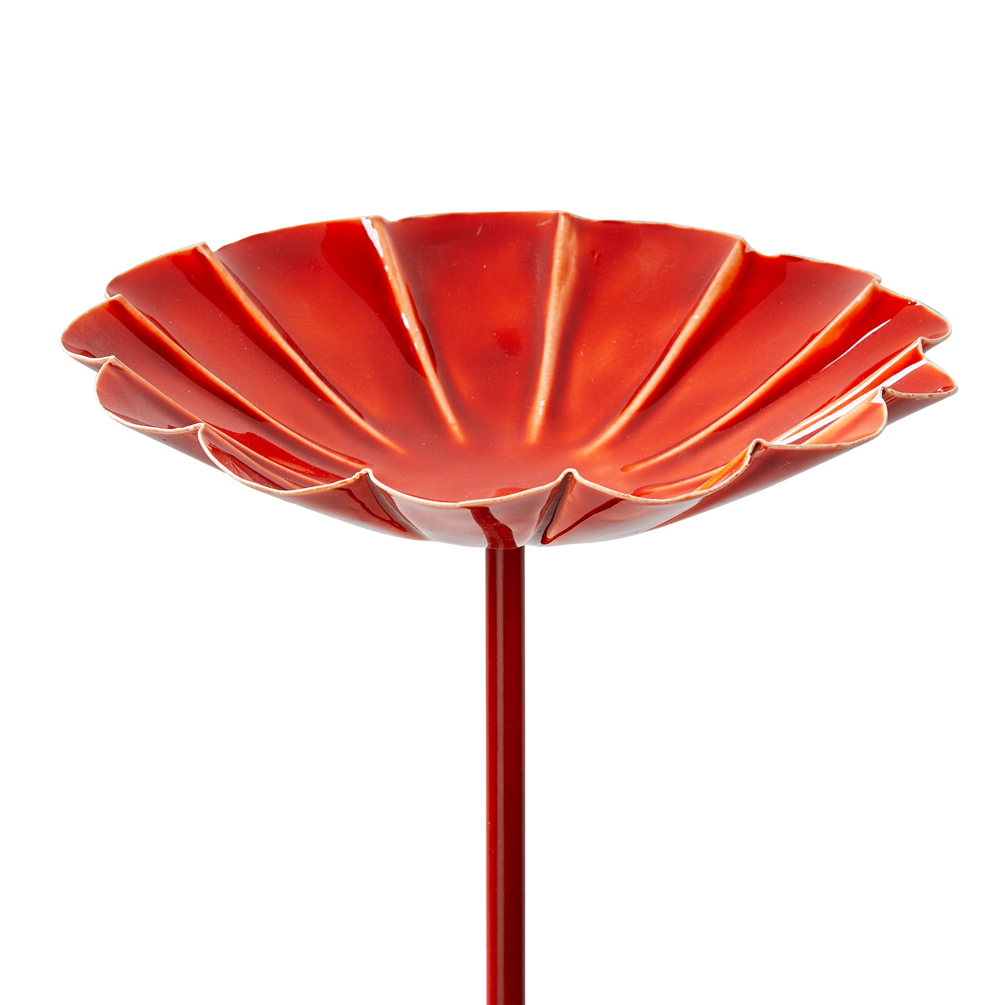 A beautiful and functional hand-crafted enamel iron bird bath on a garden stake. Outdoor safe.