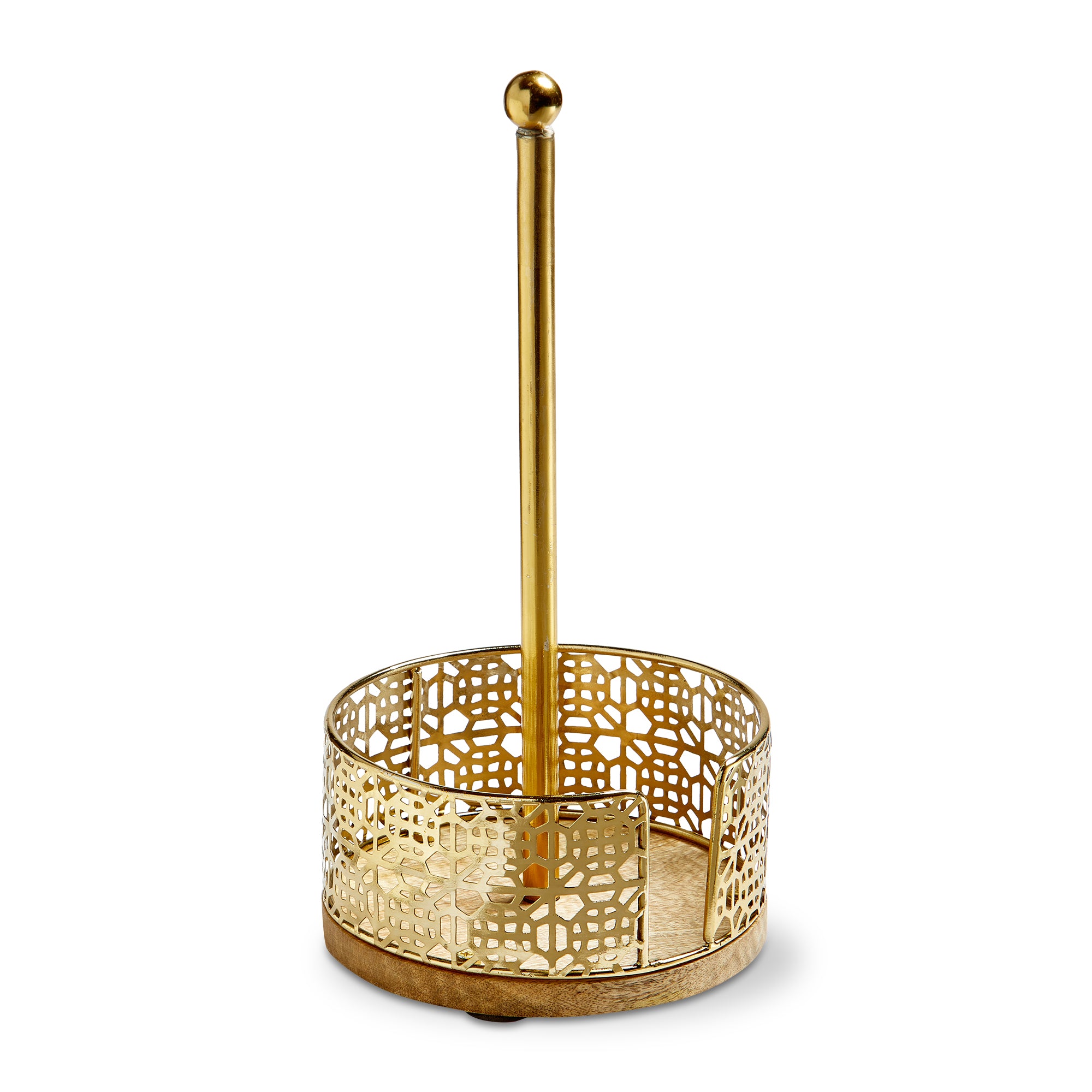 Hand-crafted gold iron paper towel holder with an acacia wood base. The perfect way to elevate your kitchen with a beautiful geometric design.