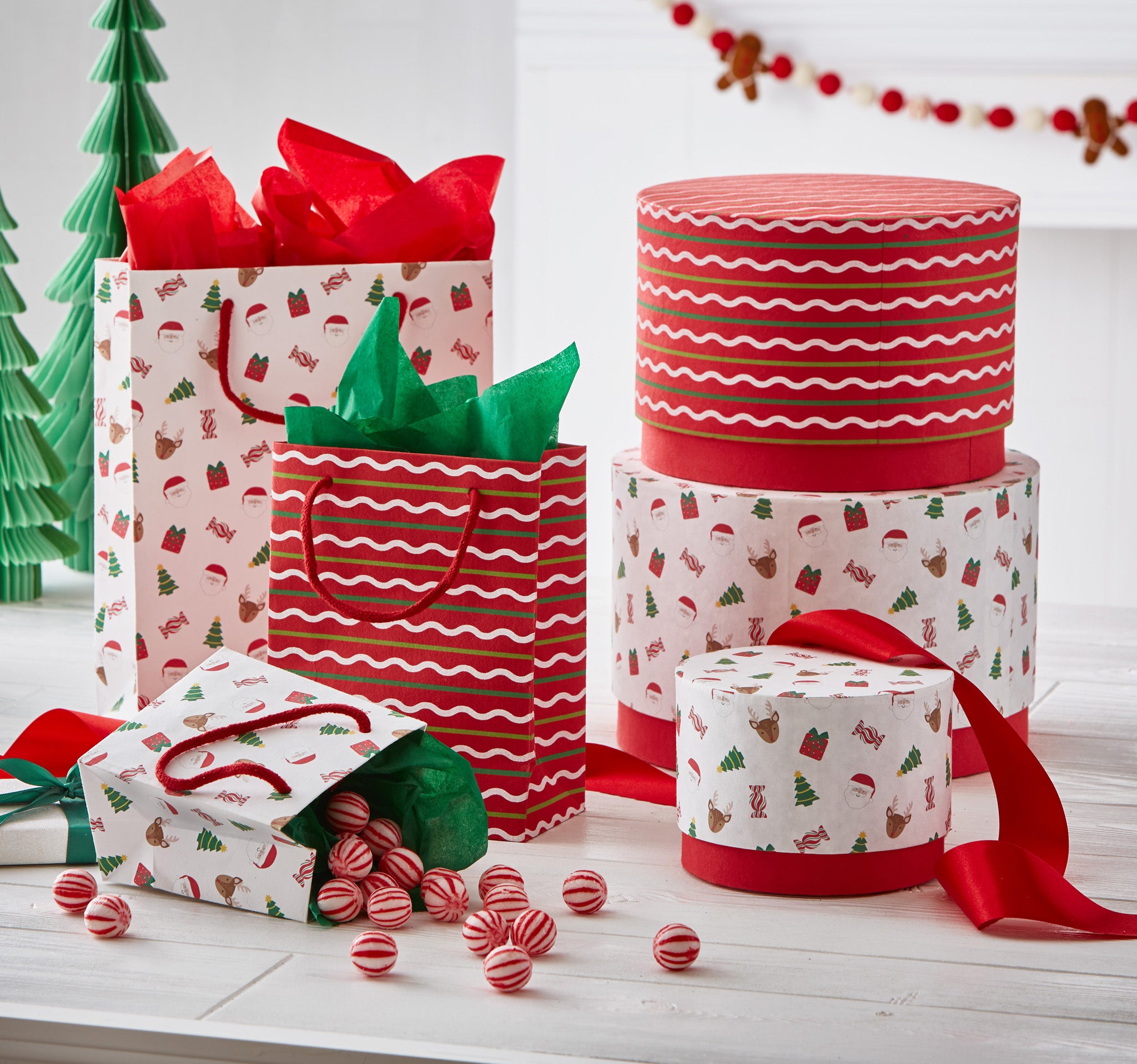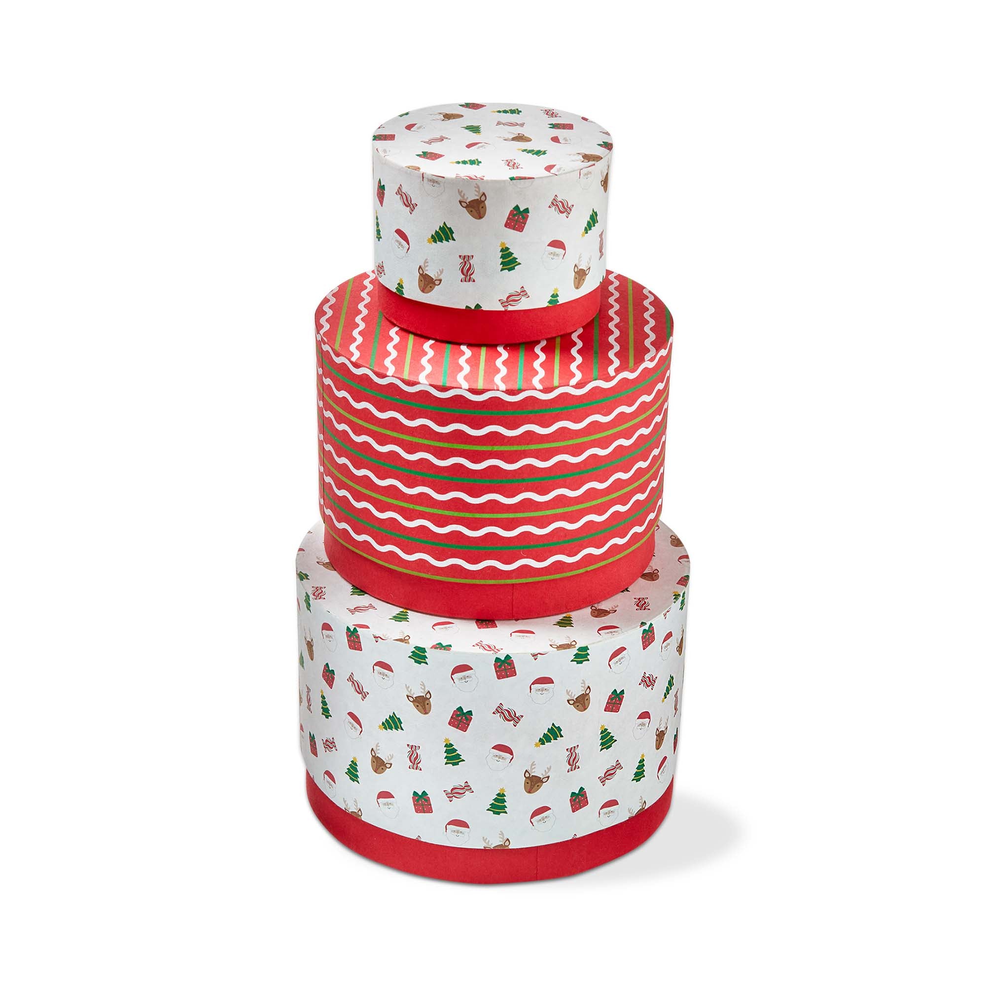 Store your holiday treasures in these festive Holiday Cheer Keepsake Boxes. Made from 100% cotton salvage from the fashion industry, these circle-shaped boxes feature fun and festive designs, including Santa, reindeer, Christmas trees, candy, and presents.