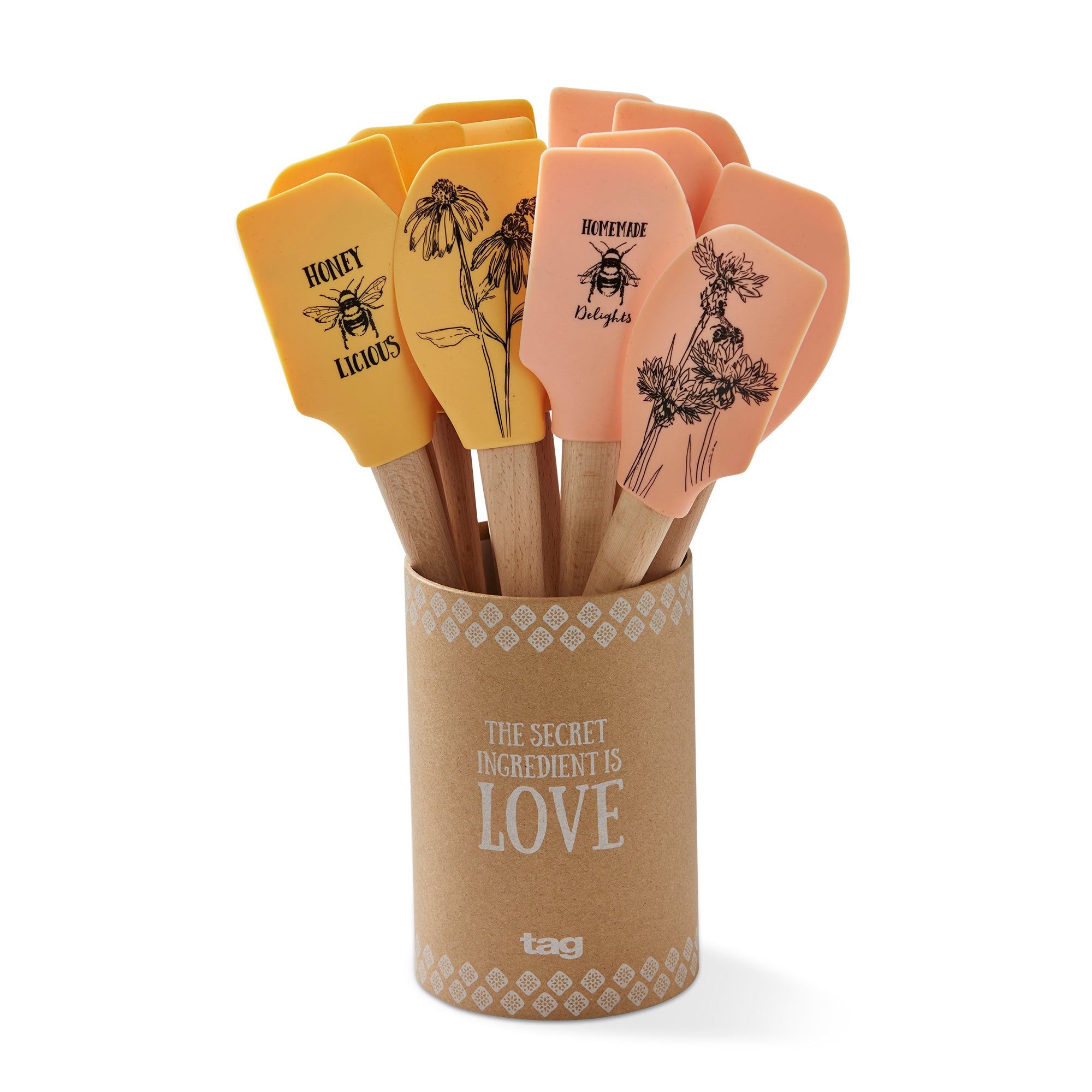Whip up delicious spring and summer treats with this adorable kitchen utensil. this tool is made with soft, pliable silicone head with a beech wood handle, making it ideal for stirring cake batter or folding cookie dough. each cdu features two decal designs, "homemade delights" and "honeylicious," and each design is double-sided. comes in an assortment of 12, with 6 of each design.