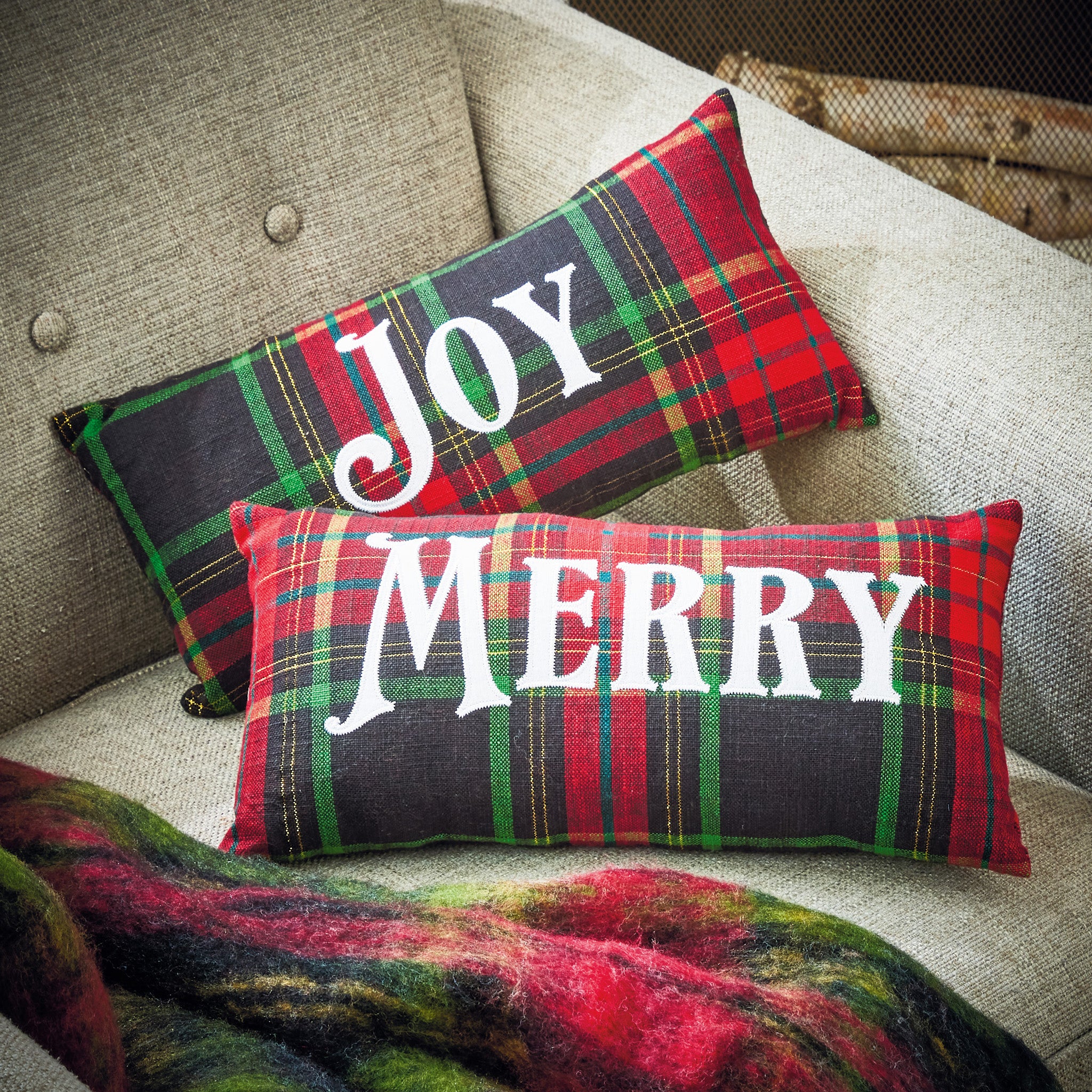 Celebrate the spirit of the season with this joyful Joy Christmas Plaid Pillow. Made from 100% cotton, this pillow features a classic red plaid pattern and the word "Joy" in white lettering.