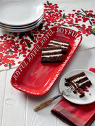 This joyful red earthenware platter is the perfect way to add a touch of cheer to your table setting. the platter features the word "joyful" written in bold white letters on a bright red background. it is made from high-quality earthenware, which is durable and easy to care for.