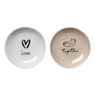 A beautiful assortment of trinket dishes featuring love notes. made from stoneware with wax resist designs and glossy finishes. use to hold small items like keys, rings, earrings and necklaces. place on side tables or entryways for easy access. each assortment of two features one of each design: "grateful for small things" and "strength". perfect for gifting.