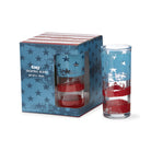 Show off your red, white, and blue! Fun patriotic drinks glass with double-sided decal design. Matte finish. Set includes: 4 each of 1 drink glass design in packaging.
