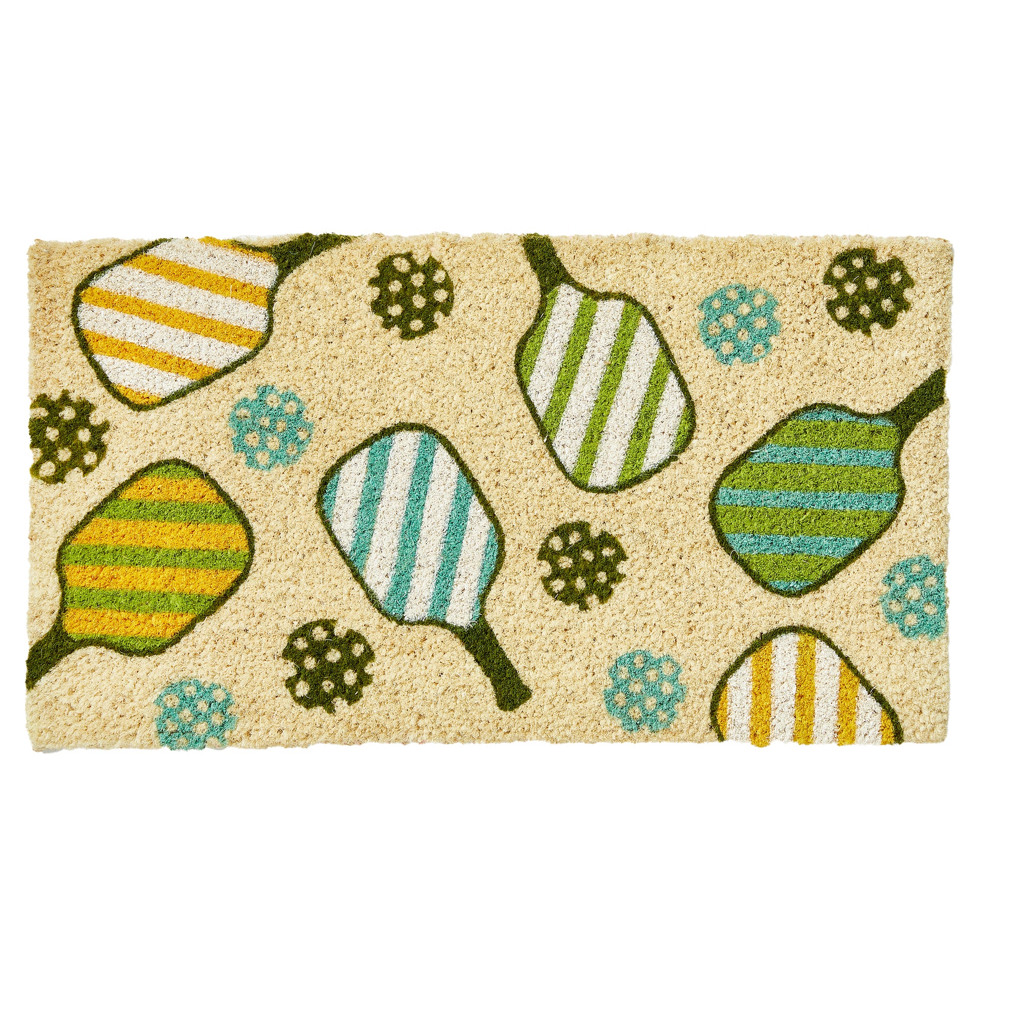 For pickleball lovers, this natural coir doormat, a tag original and favorite for over 30 years, is hand-painted with pickleballs and paddles on a hand-spun coir base.