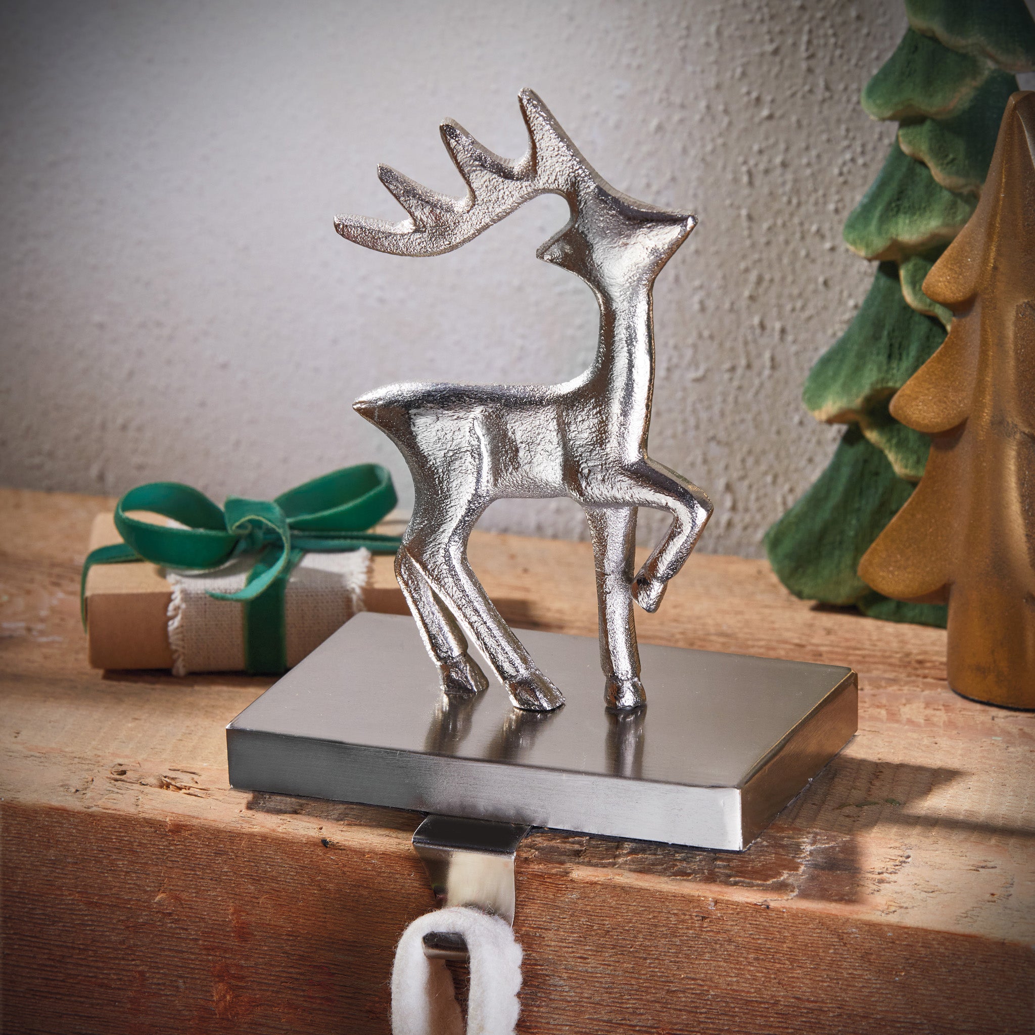Prancing reindeer stocking holder in a bright nickel finish. The sculpted silhouette and sturdy base keep stockings secure while adding a polished winter touch to the mantel. Hand painted details add warmth while its versatile design makes styling simple. Sized for layered displays and pairs beautifully with seasonal greenery and décor.