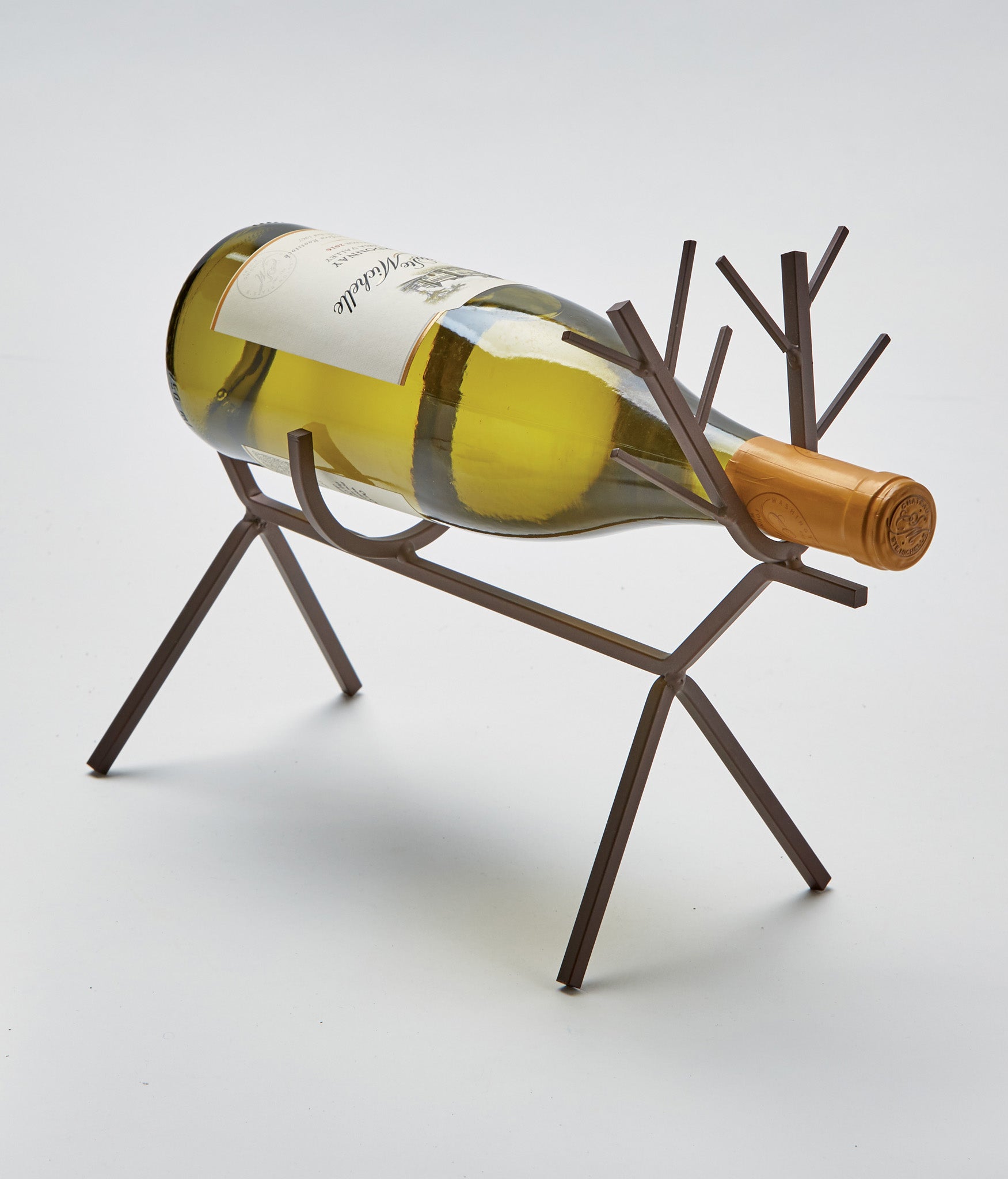 Oh, deer. this holiday reindeer is a playful take on a basic wine bottle holder. made from metal, the holder cradles your wine, while adding winter whimsy to your christmas spread. antique bronze finish matches a range of decor. holds a standard wine bottle.