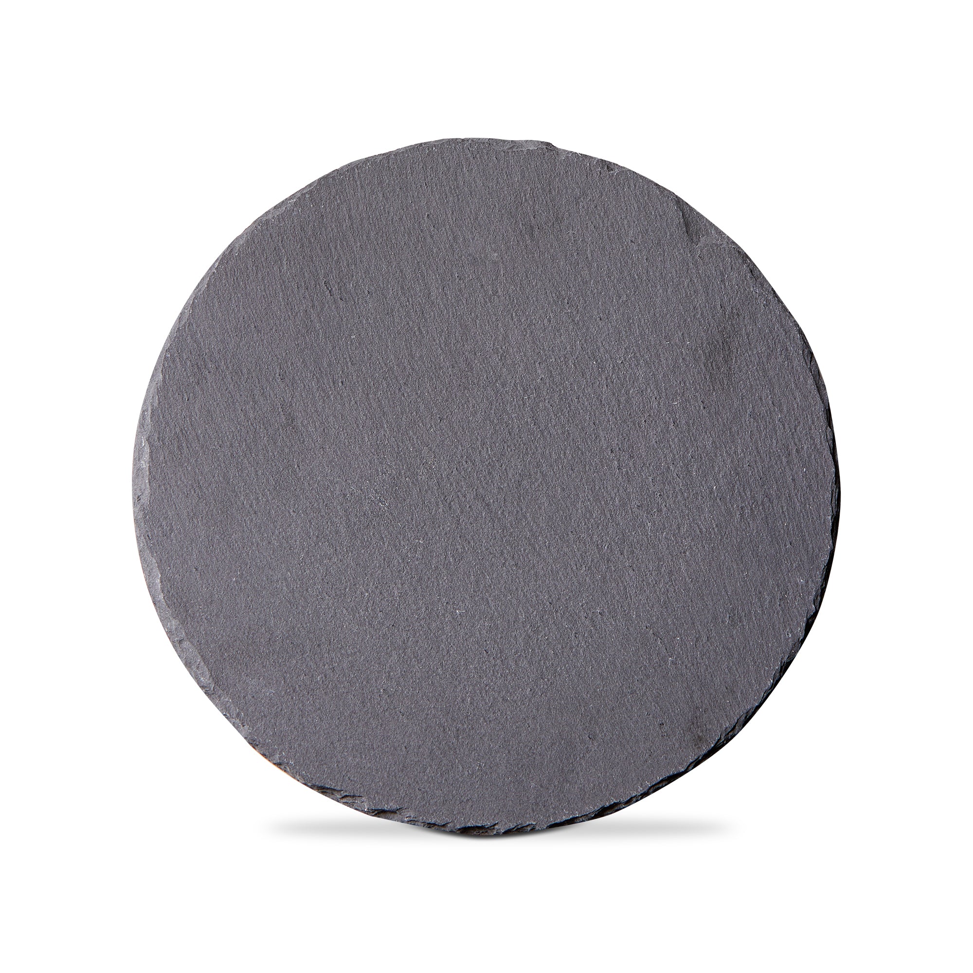 Serve appetizers or cheeses with a rustic touch on this round black slate serving board. Hand wash recommended.