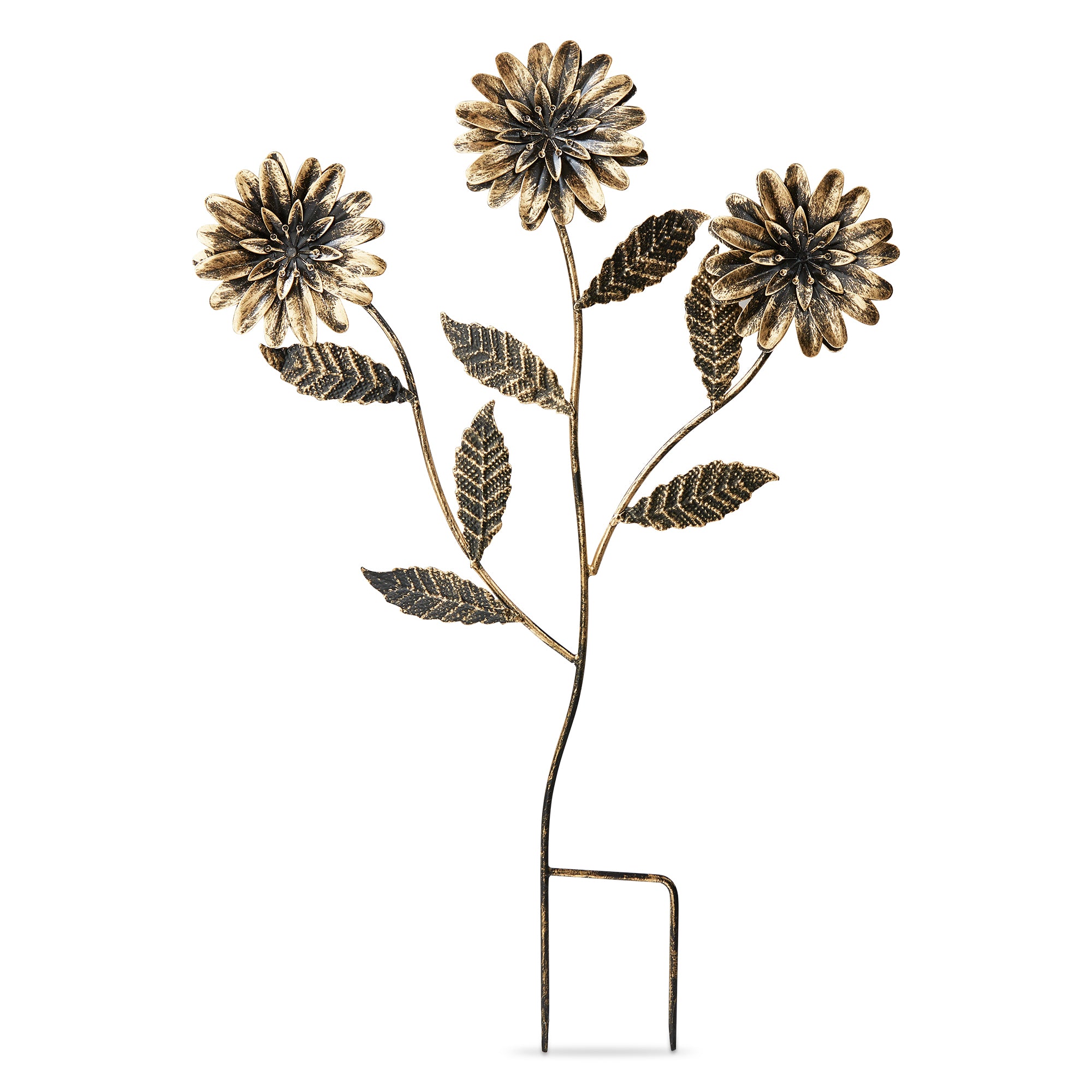 A beautiful hand-crafted antique brass iron garden addition featuring three blooming flowers on a single stake. Great for adding an elegant touch to gardens and yards.