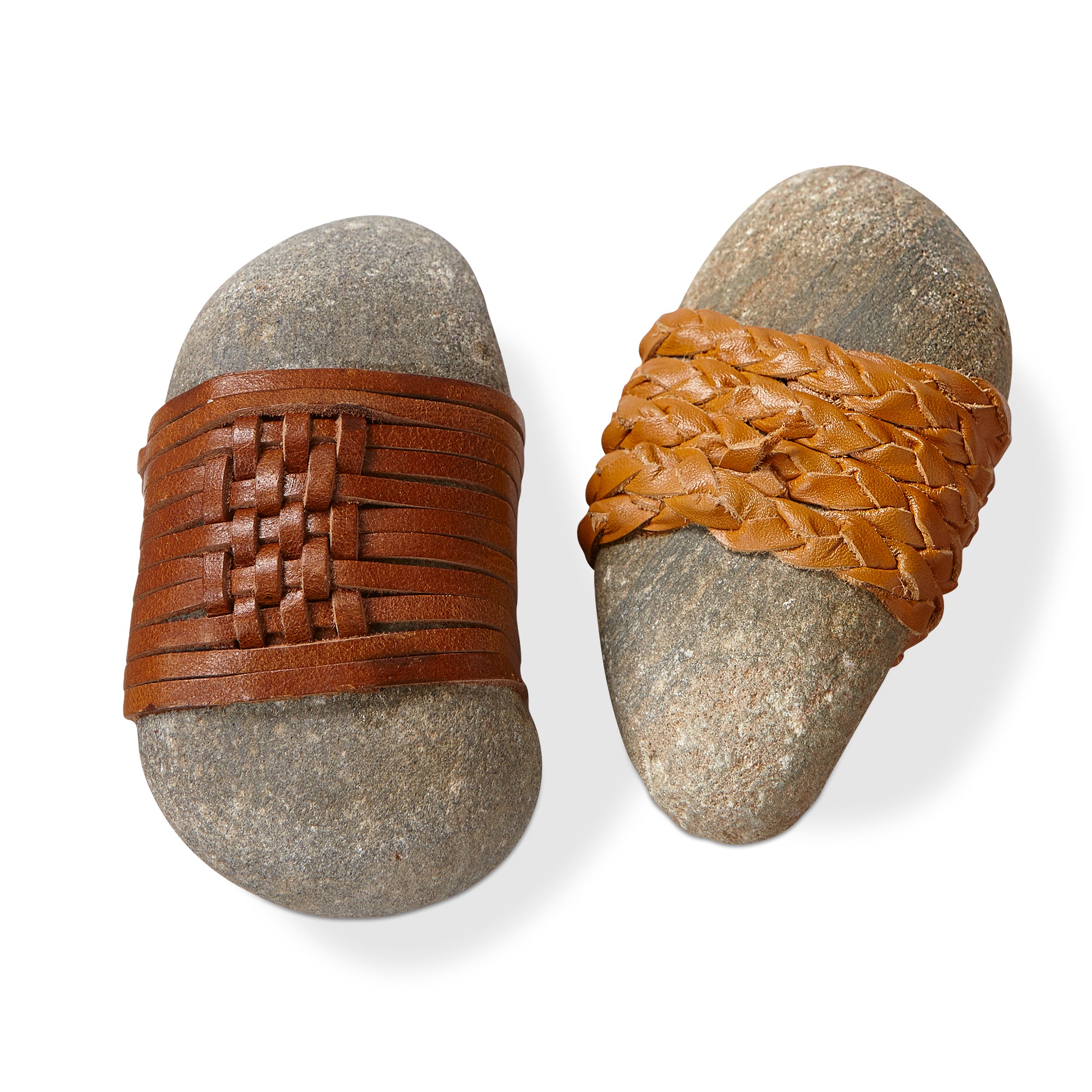 Stones are a way to connect to the natural world. Leather wrapped stones are known to accompany meditation spaces. They can also be used as decorative additions to centerpieces and display trays, or as a functional paper weight in the office. Handwoven and handcrafted by artisans. Assortment includes: 1 each of 2 designs.